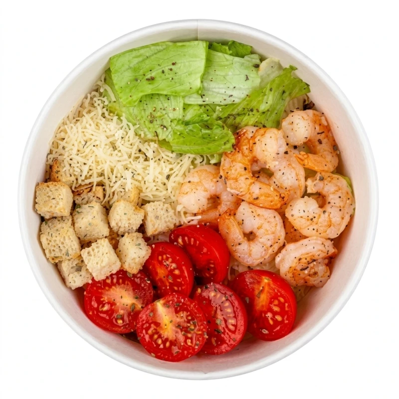 Креветка, салат айсберг, томаты черри, сыр пармезан, гренки, соус цезарь, итальянские травы